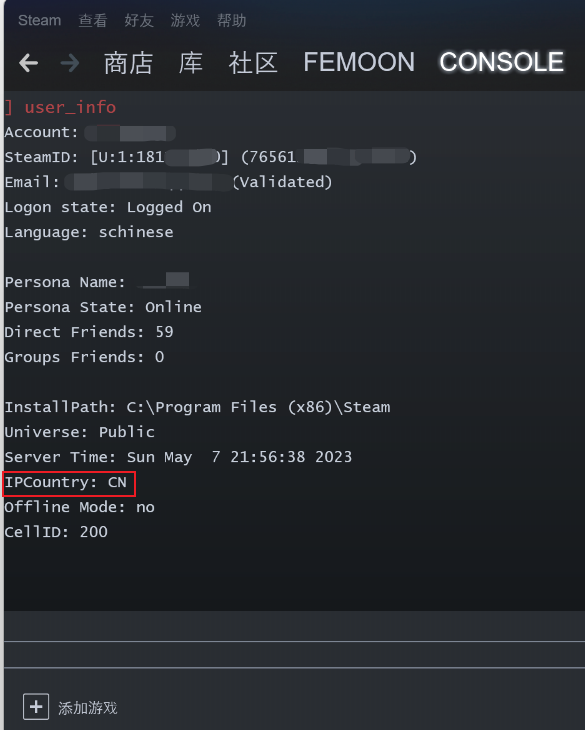 3.重启 steam,重启登录成功后浏览器运行 steam://open/console**,**通过在 console 中输入 user_info 查看 IPCountry,显示 为 CN 代表分流成功!