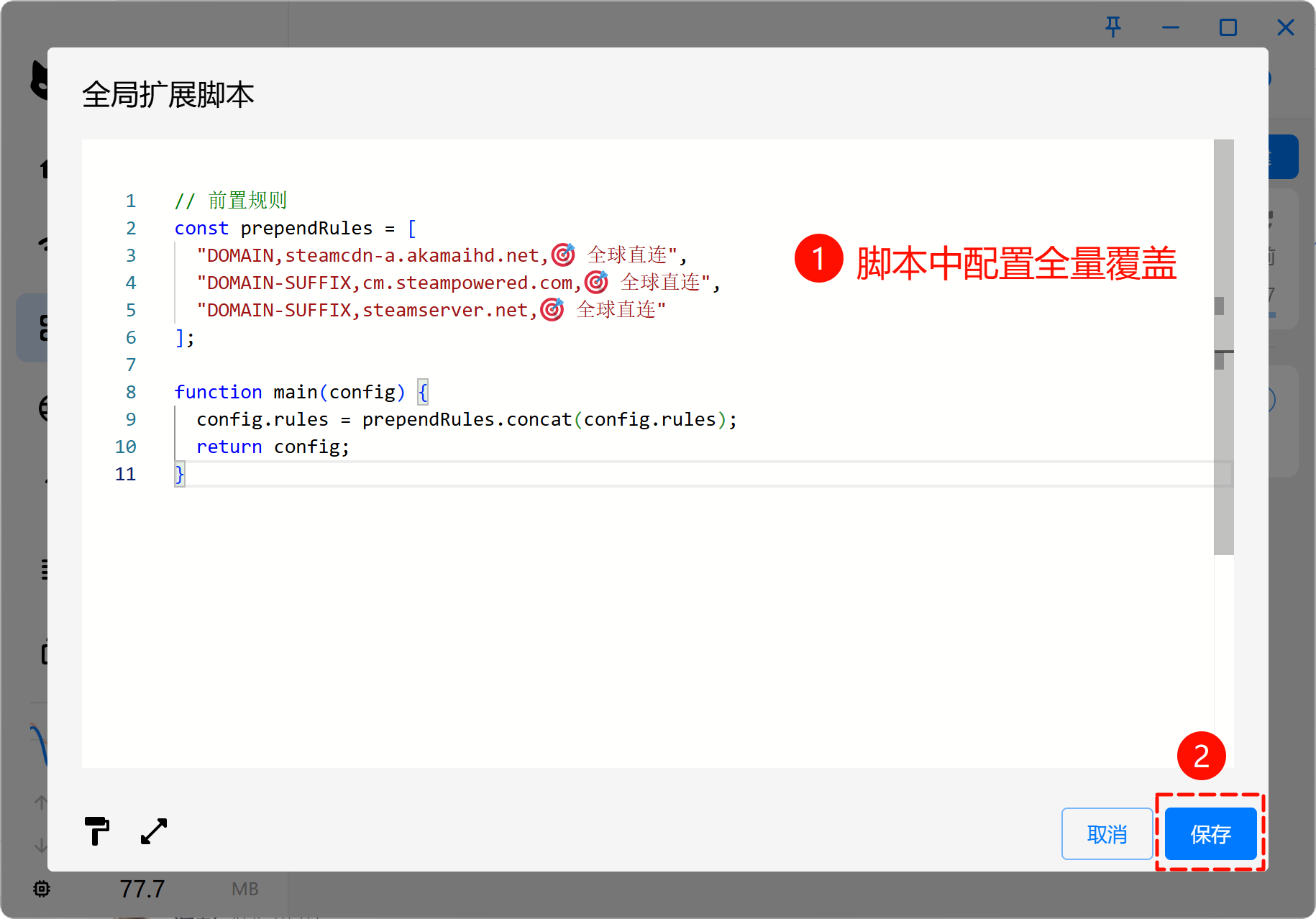 - DOMAIN-SUFFIX,steamserver.net,🎯 全球直连3.保存配置后,更新订阅 后检查分流是否生效