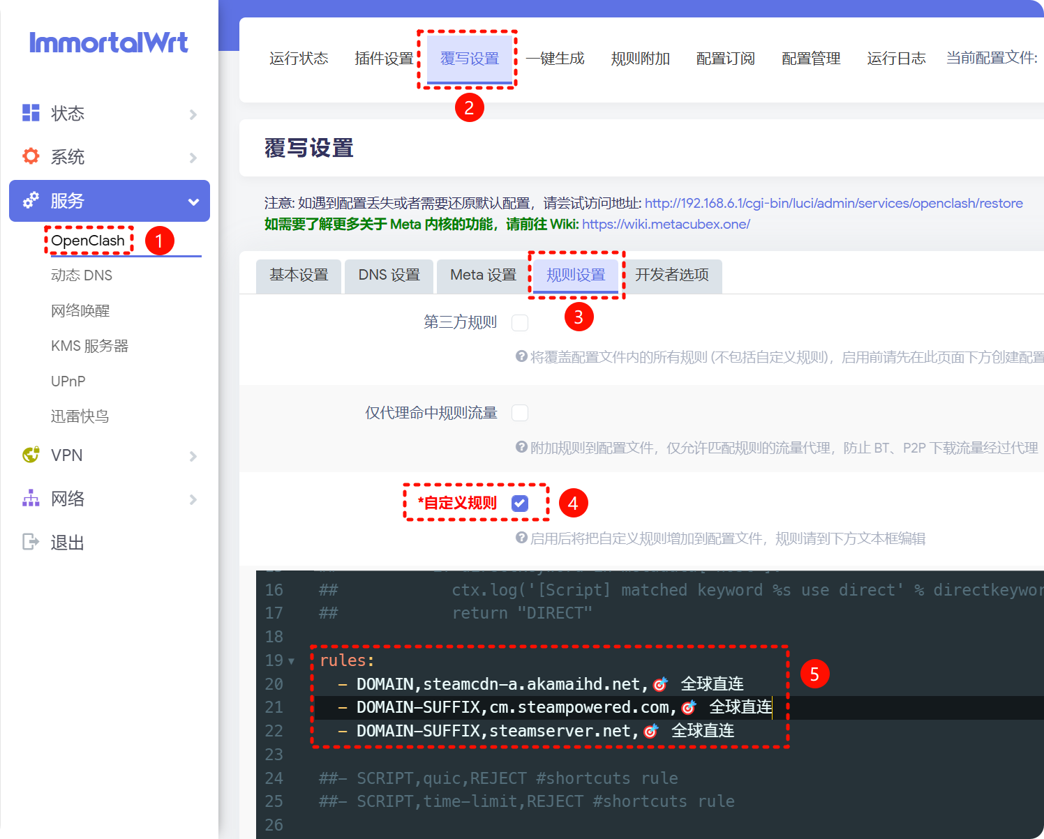 - DOMAIN-SUFFIX,steamserver.net,🎯 全球直连2.保存配置后,等待 OpenClash 重启完成