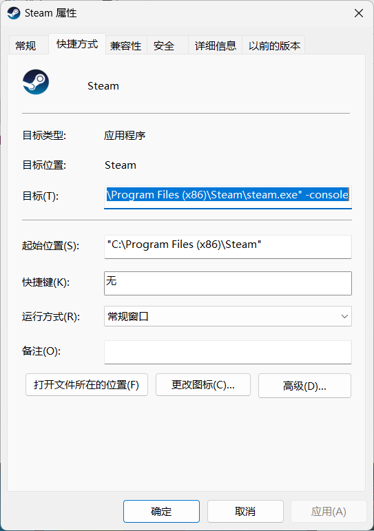 - Steam 呼出 console 选项卡有点麻烦,可以给快捷方式右键属性,目标路径添加